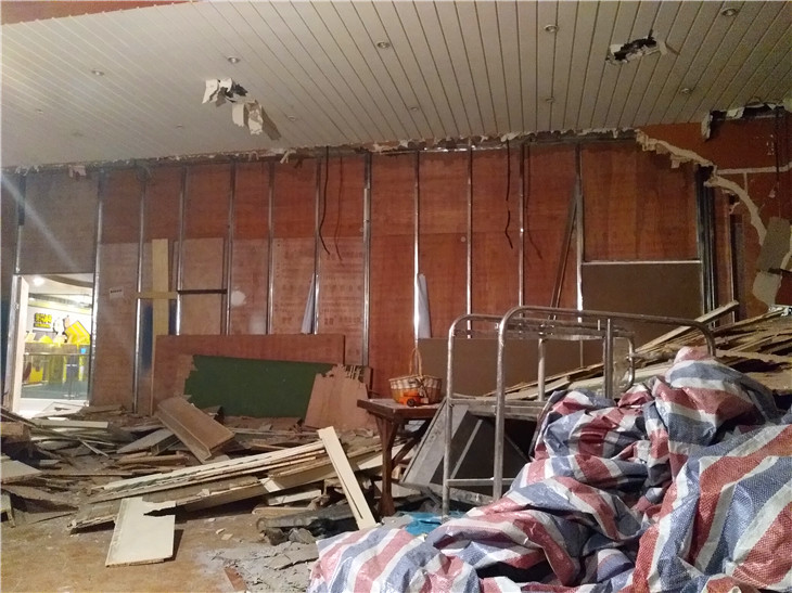 施工進(jìn)度:繼續(xù)進(jìn)行現(xiàn)場的地臺瓷磚拆除,頂部實木吊頂,石膏板拆除,及時清運現(xiàn)場的裝修垃圾和建渣。