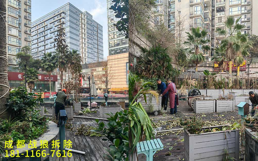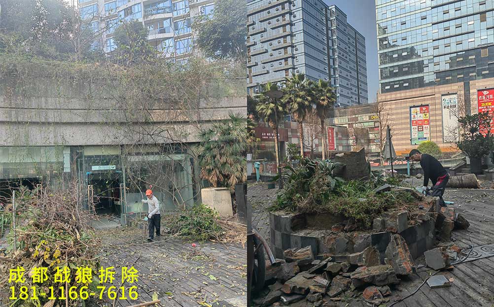 內(nèi)容:商業(yè)街商鋪里面全屋地磚拆除,吊頂拆除,商鋪外面外擺180平,防腐木拆除,樹(shù)木修剪,花臺(tái)拆除,衛(wèi)生清潔,建渣裝車(chē)清運(yùn)。